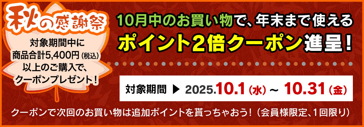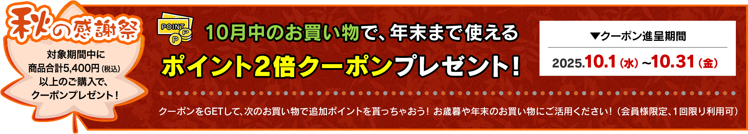 10月中に商品合計5,400円以上のお買い物で「年末まで使えるポイント2倍クーポン」を進呈致します。