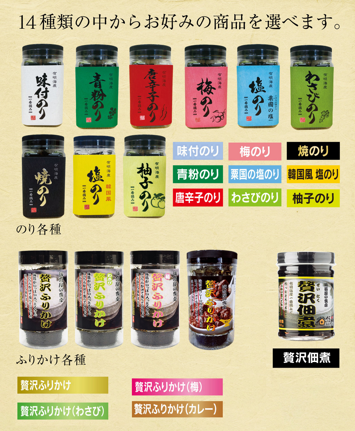 住吉海苔本舗自慢の味付のりと贅沢ふりかけ、贅沢佃煮からお好きな組み合わせで選べる6品セット。