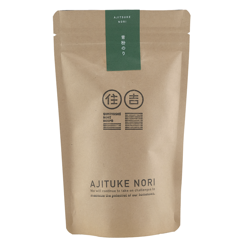 磯の風味豊かな青粉(アオコ)を住吉海苔本舗自慢の味付のりにトッピング。厳選して選びぬいた、住吉海苔本舗の味付のりに一番合う青粉(アオコ)を使用。
